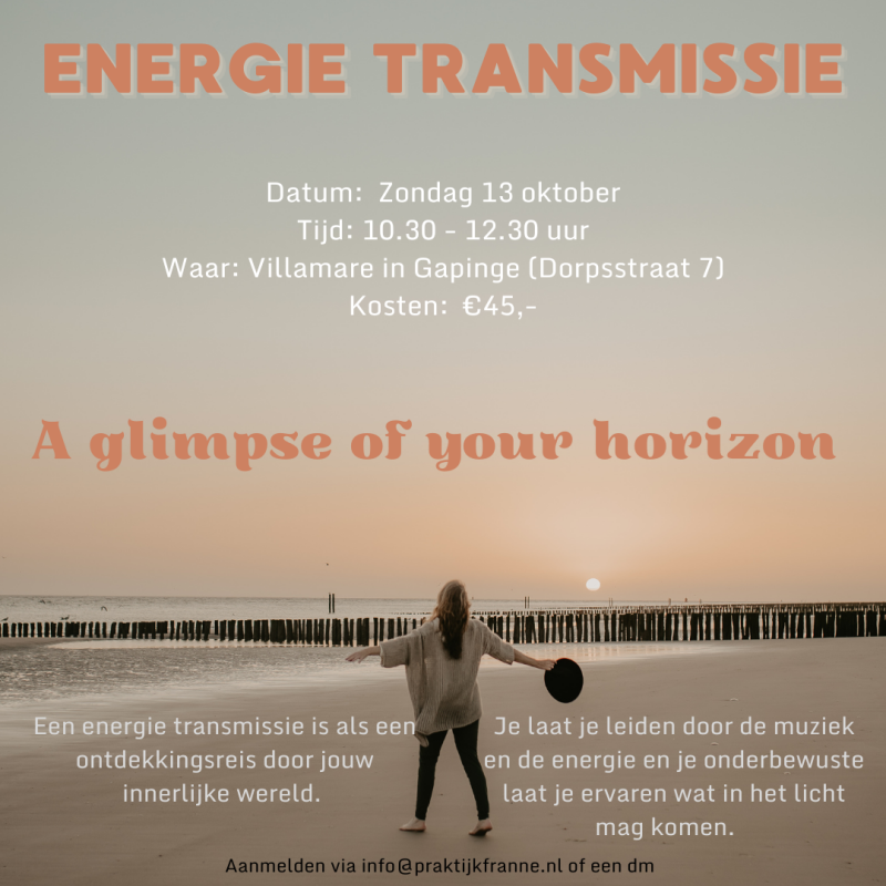 Bij een energie transmissie lig je op een mat. Ik gebruik muziek om de energiefrequenties kracht bij te zetten. Jij mag ontspannen en in overgave gaan. Dat houdt in dat je je laat leiden door de energie en de muziek. Dat alles wat jij voelt of wilt doen dat je dat ook daadwerkelijk doet. Tijdens een transmissie kunnen er verschillende uitwerkingen zijn: bewegingen van het lichaam, emoties die opkomen, beelden die in het derde oog verschijnen of sterke inzichten. Ook kan je niets ervaren, wat niet betekent dat de energie niet werkt, maar dat de shift in het onderbewuste plaatsvindt en zijn uitwerking zal hebben tijdens de integratieperiode.